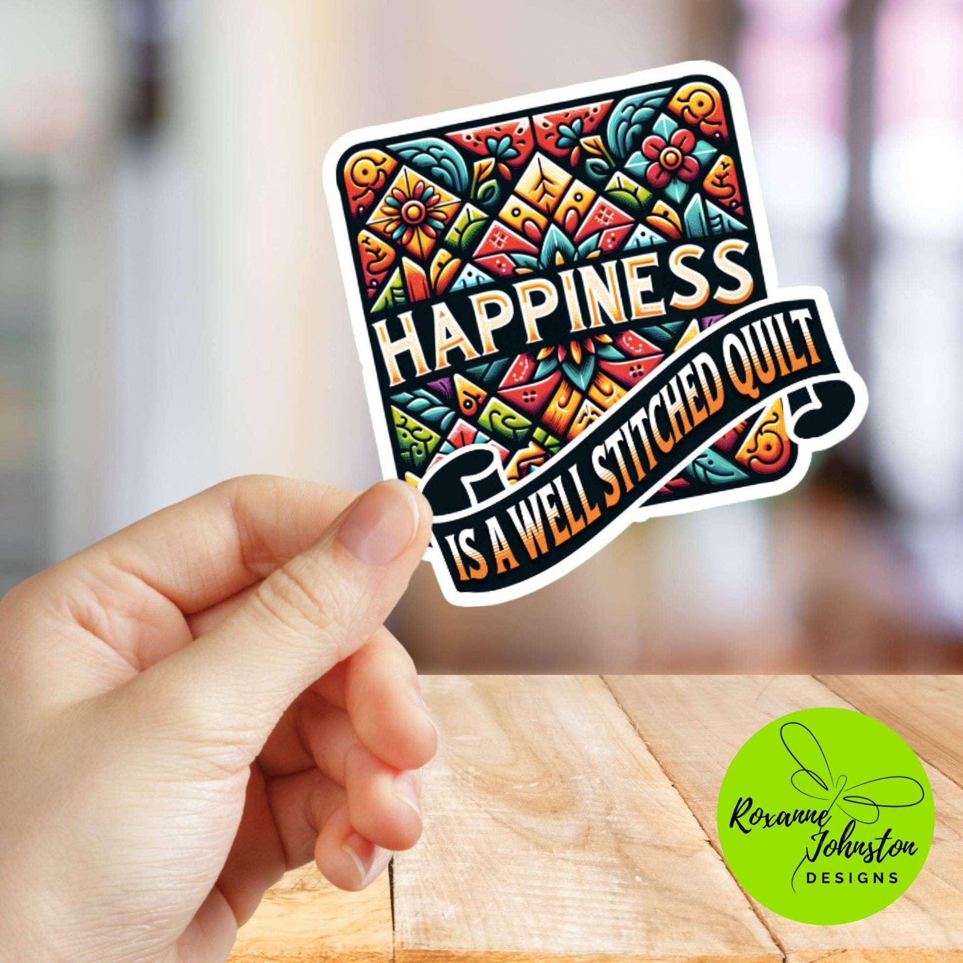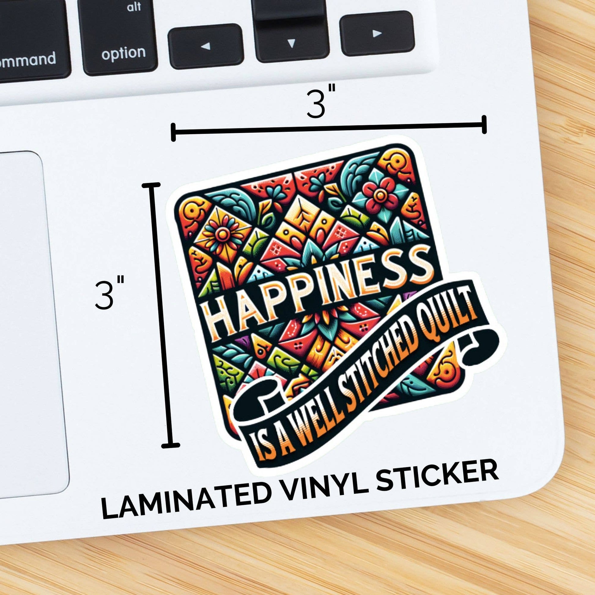 Quilter sticker. Add a touch of charm to your crafting space with our vinyl water-resistant sticker, proudly declaring "Happiness Is A Well Stitched Quilt." Perfect for quilters of all skill levels, this durable sticker is designed to withstand the rigors of your creative endeavors, whether adorning your sewing machine, water bottle, or crafting toolbox. Let it serve as a reminder of the joy found in the art of quilting, bringing a smile to your face with every stitch. Stick it anywhere you need a little extra inspiration and celebrate the timeless craft of quilt-making with this delightful accessory.