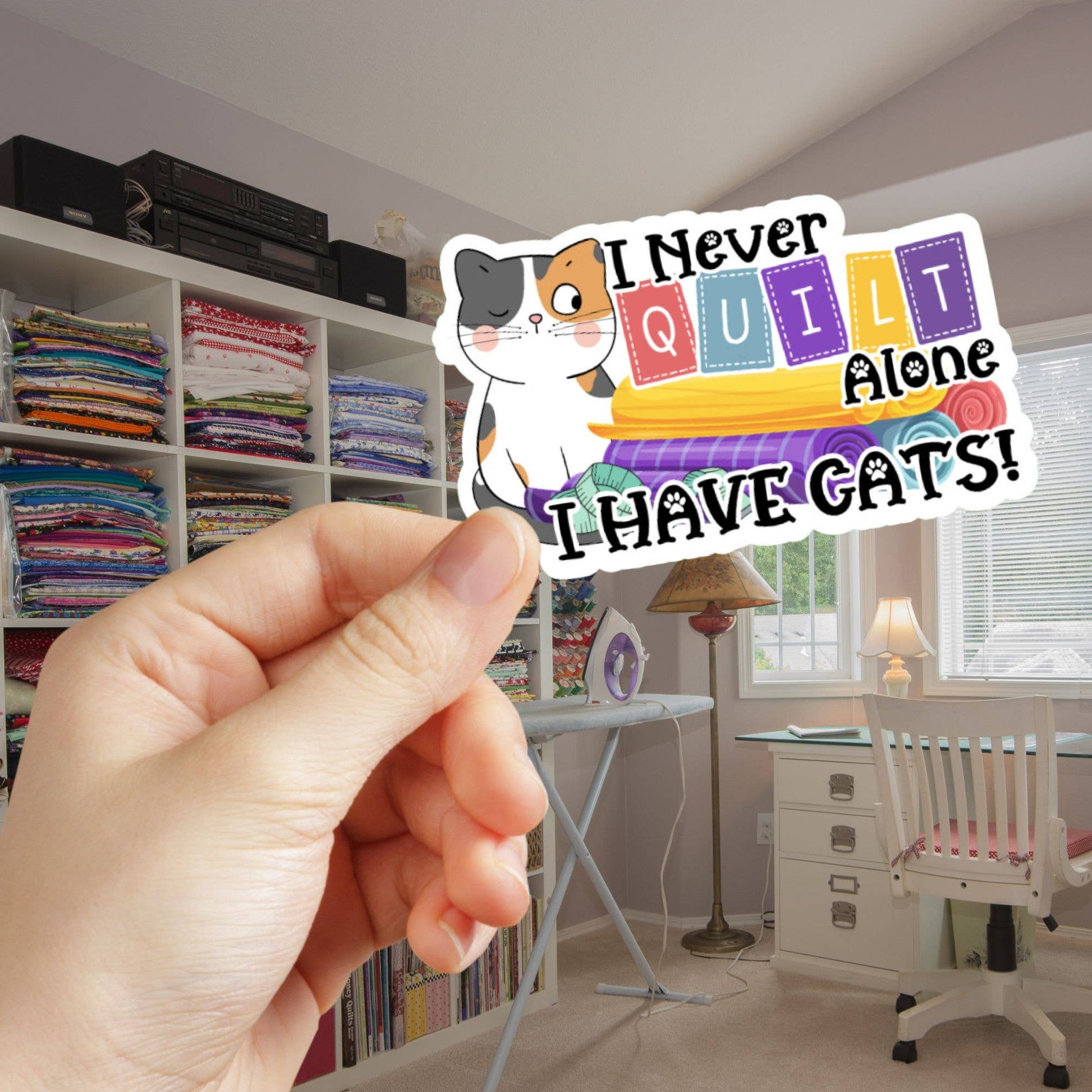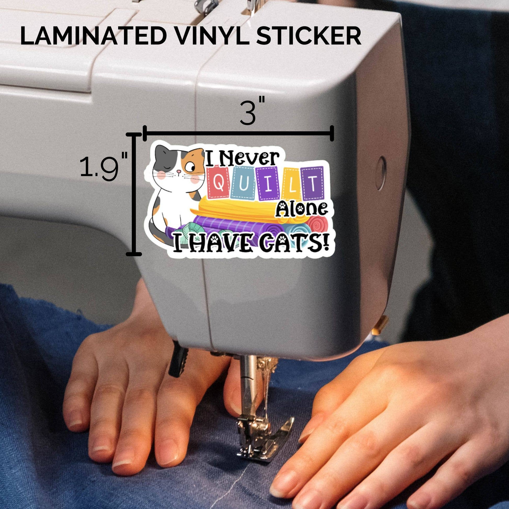Celebrate your love for quilting and feline companions with our adorable vinyl water-resistant sticker. Featuring an endearing kitten and the playful phrase "I Never Quilt Alone, I Have Cats," this sticker is a must-have for quilters and cat enthusiasts alike. It's the purr-fect way to showcase your passions on laptops, notebooks, or any smooth surface!