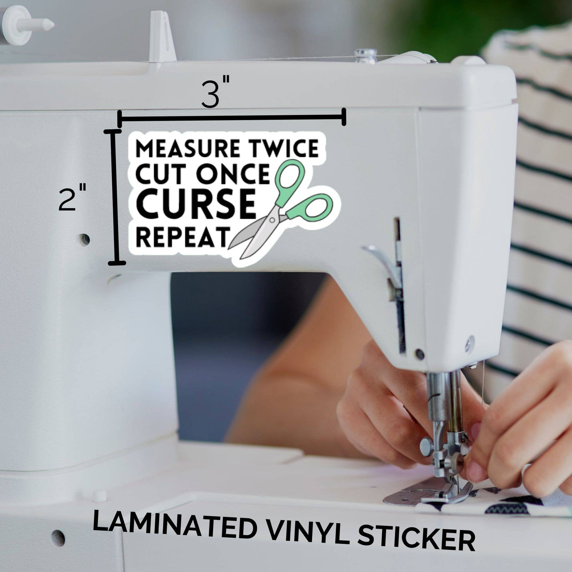 Add a touch of quilter's charm to your workspace with this water-resistant vinyl die cut sticker! Featuring a delightful design of a cute pair of scissors and the witty mantra: 'Measure twice, cut once, curse, repeat.' Stick it on your sewing machine, cutting table, or crafting tools to bring a smile to your quilting routine. This sticker is not only adorable but also durable and water-resistant, making it a perfect addition to your quilting supplies. Embrace the creative process with a touch of humor – grab your sticker today and let the stitching adventures continue!